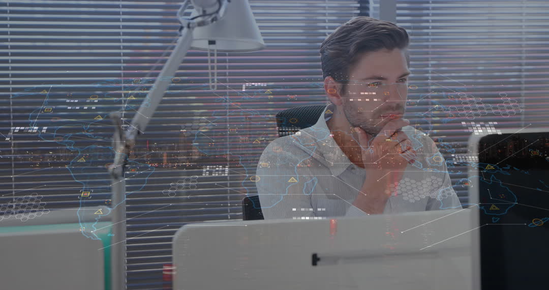 Busy professional in office scrutinizing overlaid data graphics. Useful for technology, finance, and business-related materials focused on analysis, innovation, and the integration of data-driven insights in corporate settings.