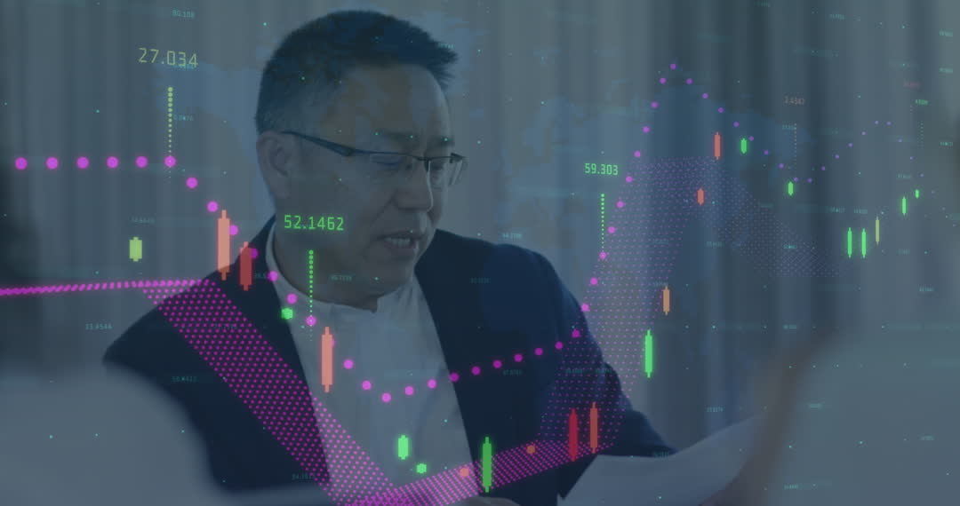 An video showing an Asian businessman appearing engaged with paper documents in his office, while an animated financial chart is superimposed over the scene, symbolizing the blend of technology and finance. Use this for content related to global business trends, financial analysis, trading strategies, and modern business environments.