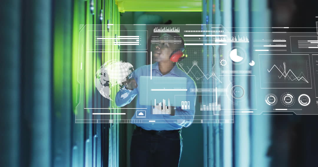A businessman in a server room views digital financial metrics displayed on a virtual interface. This can be used to illustrate technology integration in business, the role of data analytics, or corporate finance solutions in presentations and promotional materials.