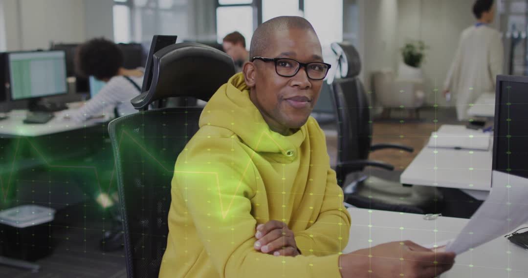 A businessman wearing a bright yellow hoodie is seated at his desk, reviewing documents. In front of him, digital charts suggest financial or data analytics activities. Office is filled with colleagues working at their computers. This is ideal for illustrating concepts of modern business environments, technological advancements in workplaces, and promoting diversity and inclusion in professional settings.