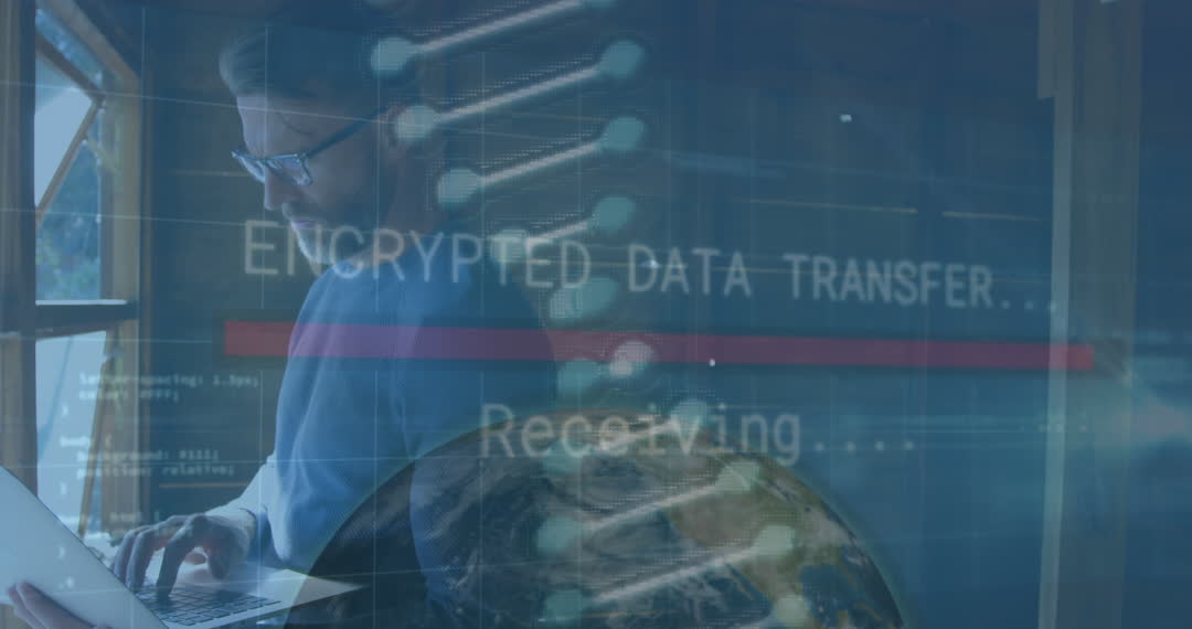 Content features a businessman using a laptop for analyzing encrypted data involving global connections, illustrating themes of technology, cybersecurity, and data analysis highlighting digital information flow. Ideal for presentations about data privacy, lectures on cybersecurity, or informative articles about technology in business and secure data transfer processes.