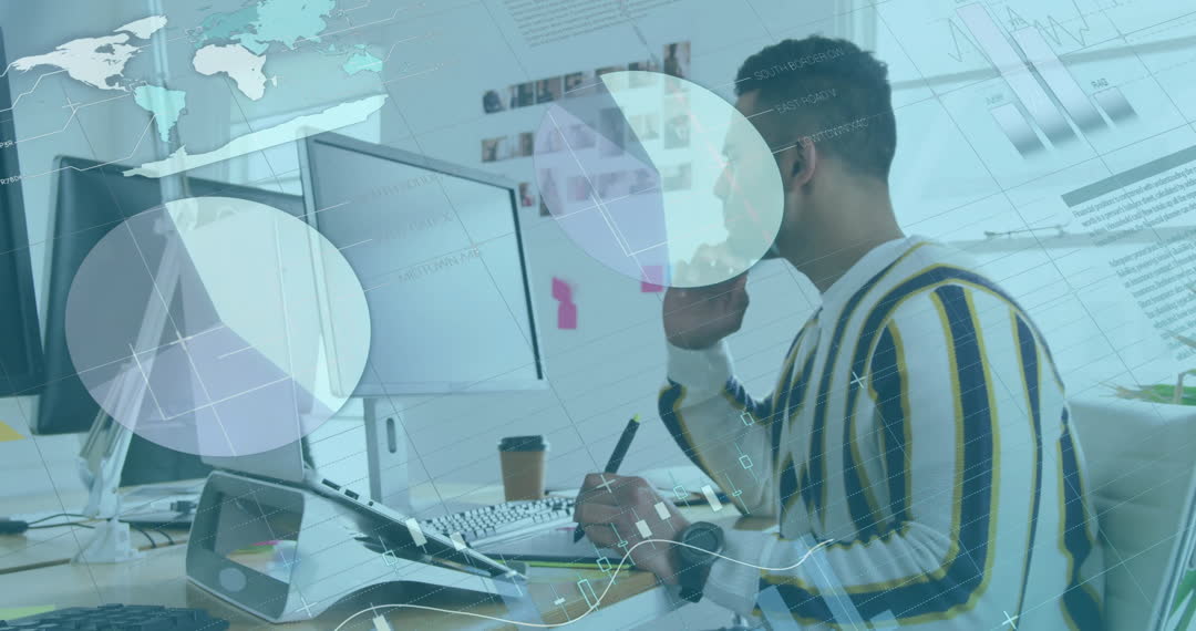 Visual showing a businessman intensely focusing on computer screens, analyzing complex financial data. Chart overlays and global routes emphasize technological integration and global finance trends. Useful for articles or content related to business analysis, economic data insights, financial technology, and corporate productivity.