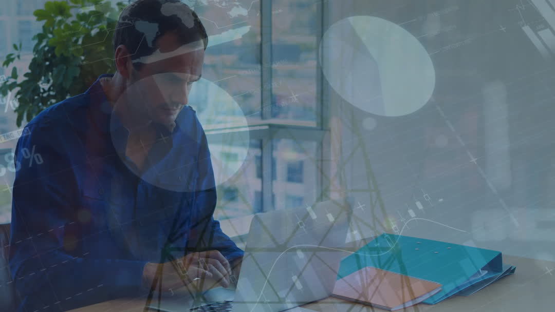Businessman is focusing on financial data displayed on his laptop, surrounded by overlay graphics showcasing digital charts and graphs. This scene embodies the modern intersection of finance and technology in a corporate office environment and can be used for materials related to finance, business innovation, technological advancement, or work strategy involving economic analysis.