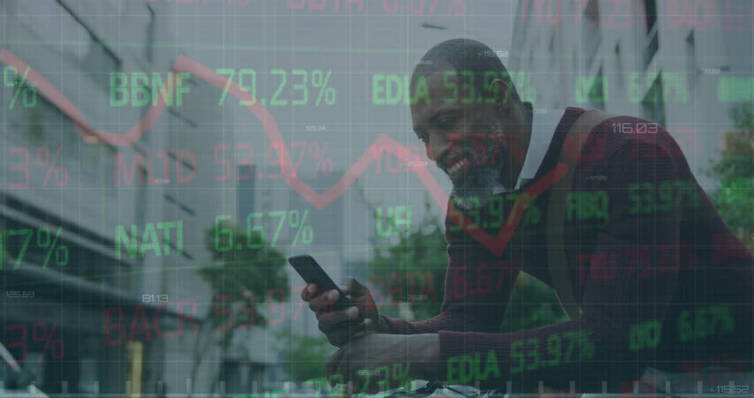 Businessman engaging with financial information on his smartphone while various stocks and percentage data float in the foreground. Perfect for illustrating topics like stock market analysis, mobile finance applications, business strategies, or technology-driven finance solutions. Useful for financial advisory websites, portfolio management apps, or business-oriented blogs.