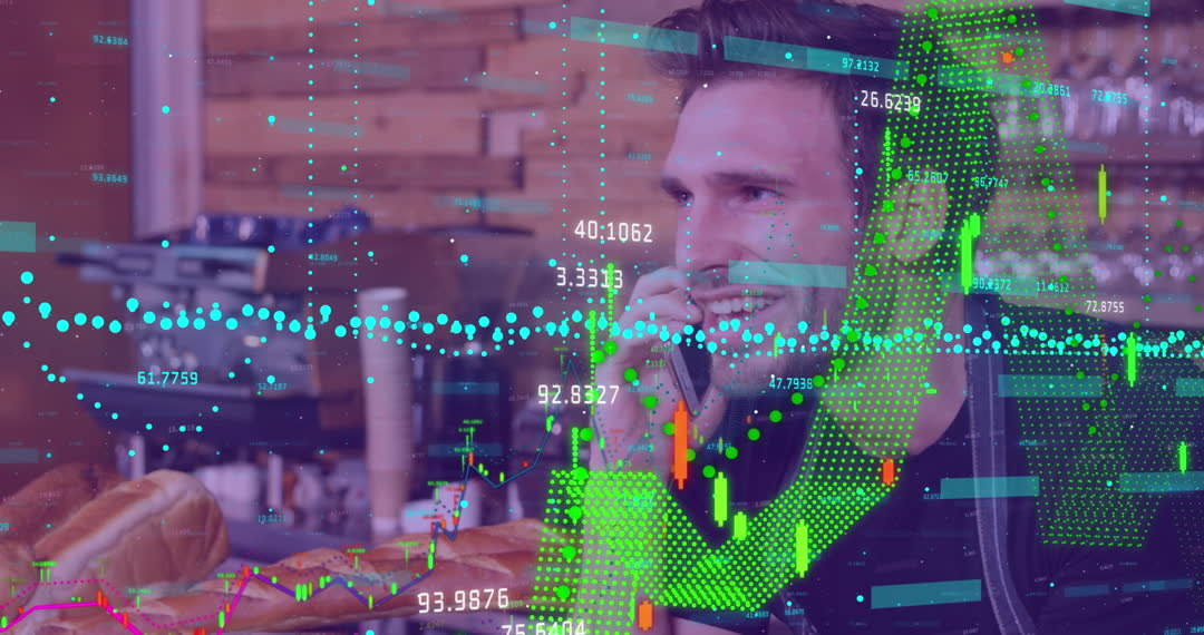 Business professional engaging in phone call while analyzing a dynamic display of stock market data. Ideal for illustrating modern financial analysis, technology in business, or digital trades. Perfect for use in articles about trends in business technology and mobile trading applications.