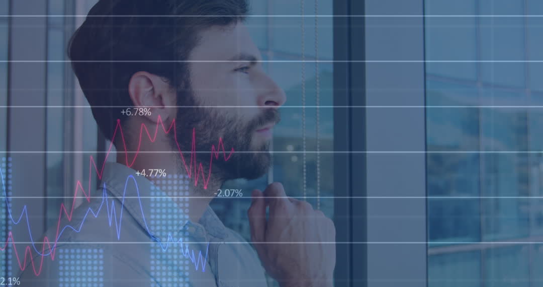 The video depicts a businessman deep in thought while observing financial graphs and data overlays through window panes, symbolizing analysis of global market trends and economic data. This visual is ideal for use in articles and presentations about financial analysis, technology in business, global economic trends, and strategic decision making.