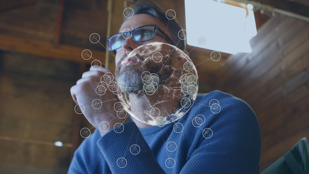 Caucasian businessman sitting with focused expression, surrounded by animated graphic of a globe with connecting lines and dots. This visual represents global networks and technological connections in a modern work environment. Useful for illustrating concepts of global business innovation, online connectivity, and modern strategic analyses in promotional materials, presentations, or articles focused on technology or business practices.