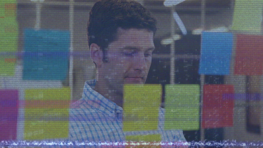 Businessman studying notes on colorful sticky paper, with digital interference effect overlay. Highlights concepts like digital technology, business planning, and problem-solving. Ideal for articles about modern business strategies, challenges in digitization, or corporate planning visuals.