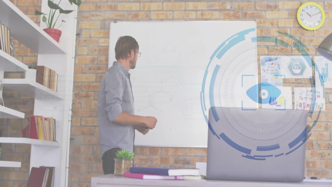 Image depicts a businessman writing on a whiteboard with futuristic digital eye overlay, symbolizing innovation and technology integration in brainstorming sessions. Perfect for articles or presentations about modern tech in business, creative team activities, security innovation, and enhancing business processes through technology.