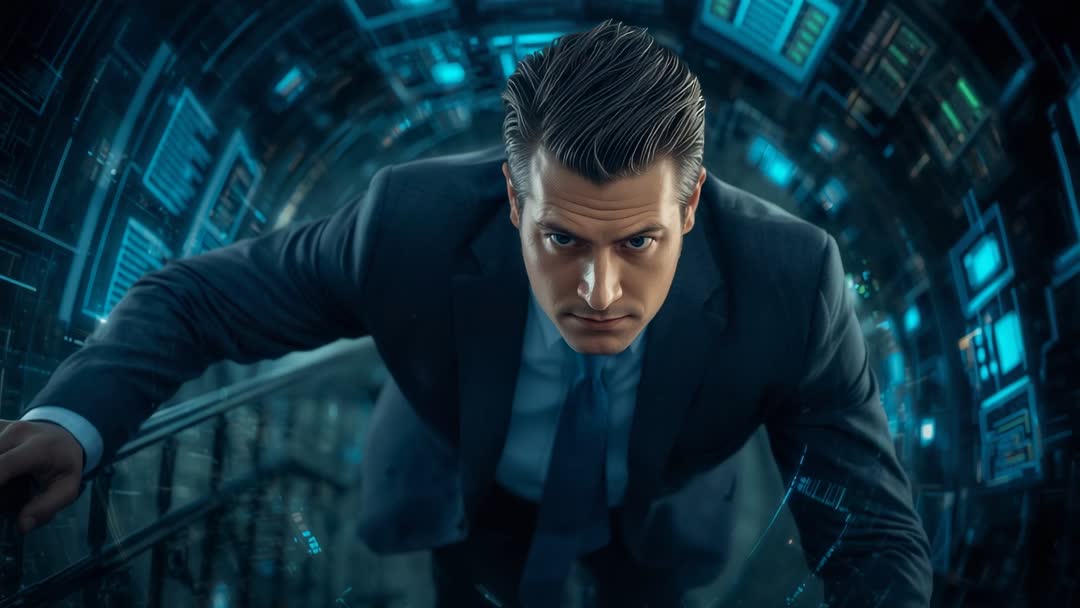 AI Generated Image. A determined businessman is climbing through a glistening digital data tunnel, hand on a handrail reminiscent of advancement and exploration. Surrounded by futuristic and glowing panels displaying abstract codes, he navigates forward, symbolizing innovation and the rapidly evolving technological landscape. This scene can represent themes of intelligence, future-thinking, and success, making it suitable for visual content in tech or educational sectors focusing on problem-solving and determination.