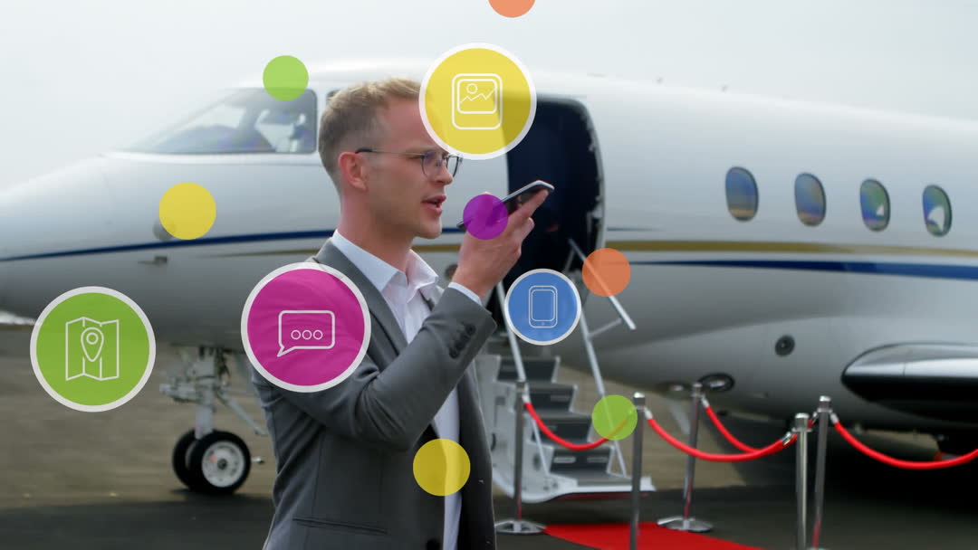 Businessman uses smartphone while standing beside a private jet, surrounded by colorful digital media icons. This visual emphasizes modern communication technology and executive travel. Ideal for promoting business solutions, travel apps, and digital communication tools aimed at professionals.