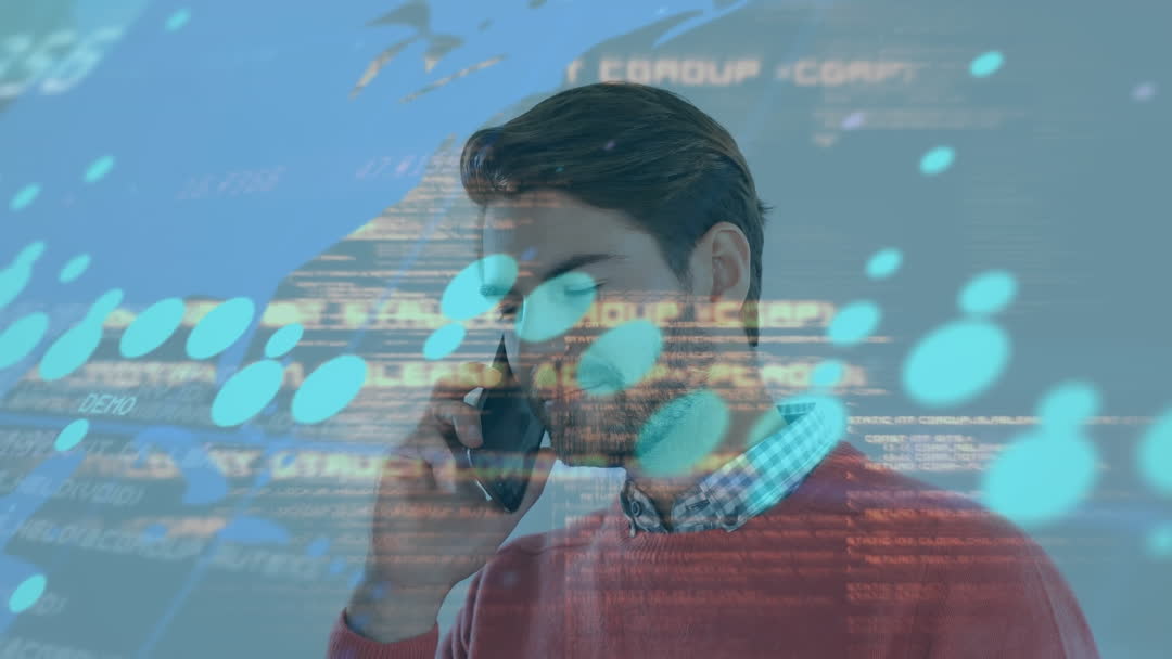 This video portrays a businessman engaged in a phone call, surrounded by a digital data overlay symbolizing modern communication technologies and data management. Ideal for use in presentations or articles related to digital transformation, corporate communication, and networking in tech-savvy environments.
