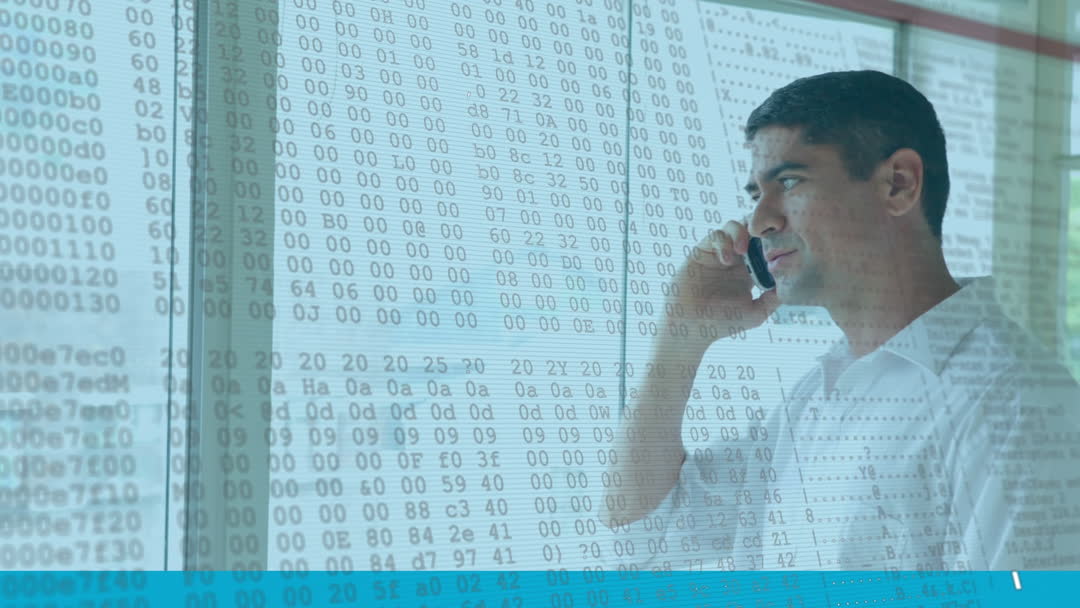 Biracial man talking on smartphone with superimposed digital data represents business and technology themes. Useful for illustrating IT and communication concepts, business analytics visuals, or technology-driven environments in presentations and corporate content.