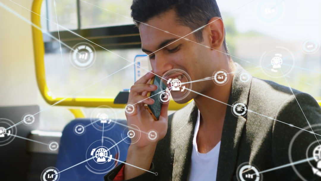Man on bus communicating via smartphone, surrounded by network interface graphics. Represents global digital communication and remote work possibilities. Useful for illustrating modern work environments, technology in business, and mobile connectivity solutions.
