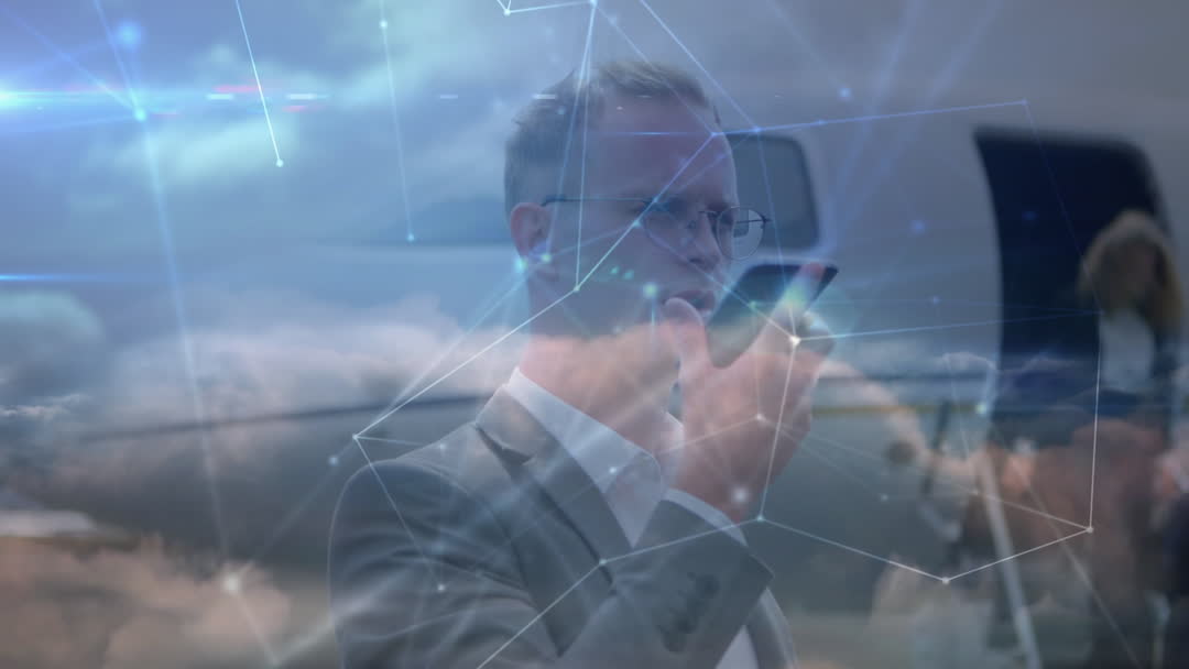 Businessman wearing suit using smartphone with dynamic digital data and connection overlay depicts modern business communication in global setting. Useful for illustrating technology in business, telecommunication services, or futuristic digital connections.