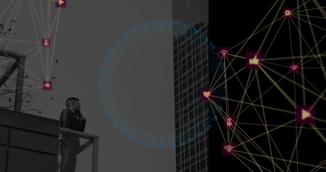 Businessman standing on a balcony engaging with smartphone, surrounded by digital icons and network graphics. Conceptual visual of modern business communication and global technology. Use for business innovation, digital transformation, or high-tech marketing campaigns.