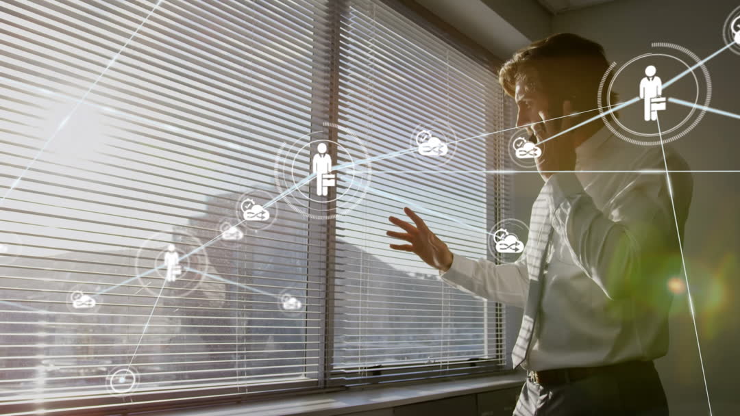 Businessman stands in office, interacting with virtual global network illustrating modern business communication. Use for depicting globalization, digitization, corporate connectivity, and business strategy in modern settings.