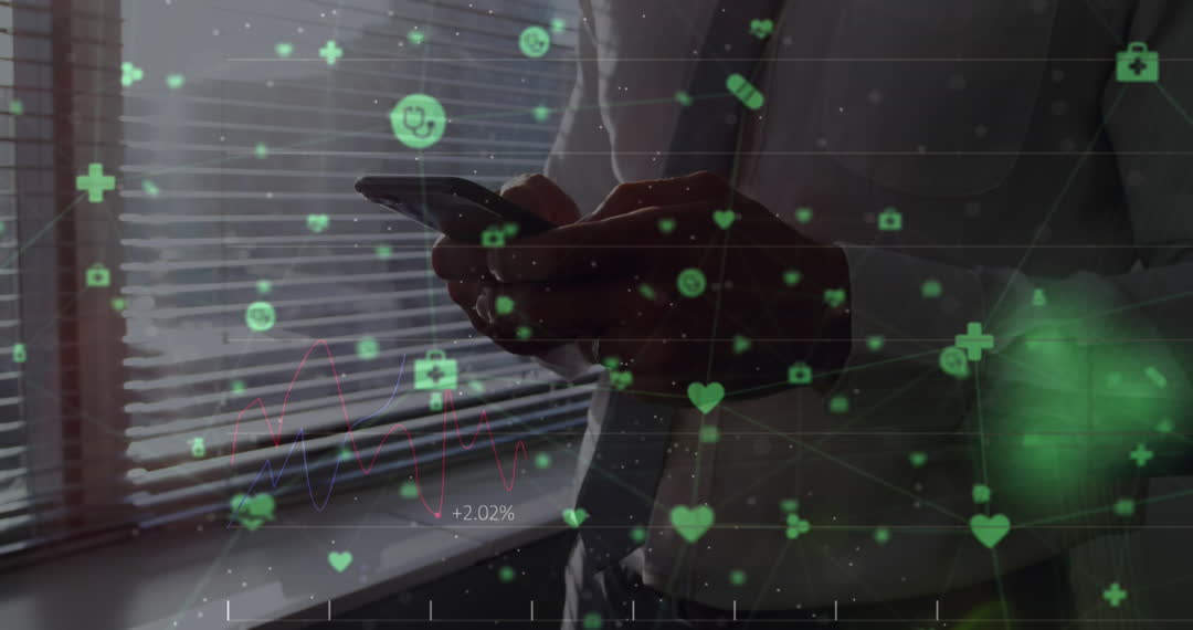 A professional male is using a smartphone with digital icons and analytics overlay, emphasizing technology integration and communication in business practices. Ideal for illustrating technology use in business, digital communications concepts, or future networking systems.