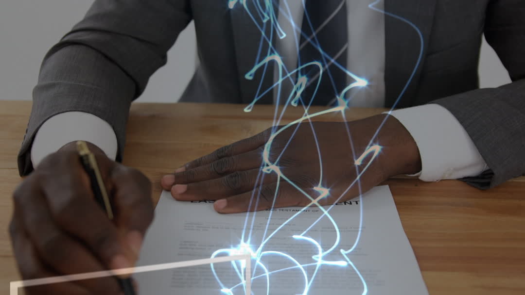 Depiction of an African American businessman signing a contract, enhanced through digital light trails to symbolize technological advancement and innovation in global business. The dynamic motion of the light suggests connectivity and futuristic approaches to agreements. Suitable for illustrating concepts of digital transformation, professional settings, business negotiations, or marketing for technology-driven services.
