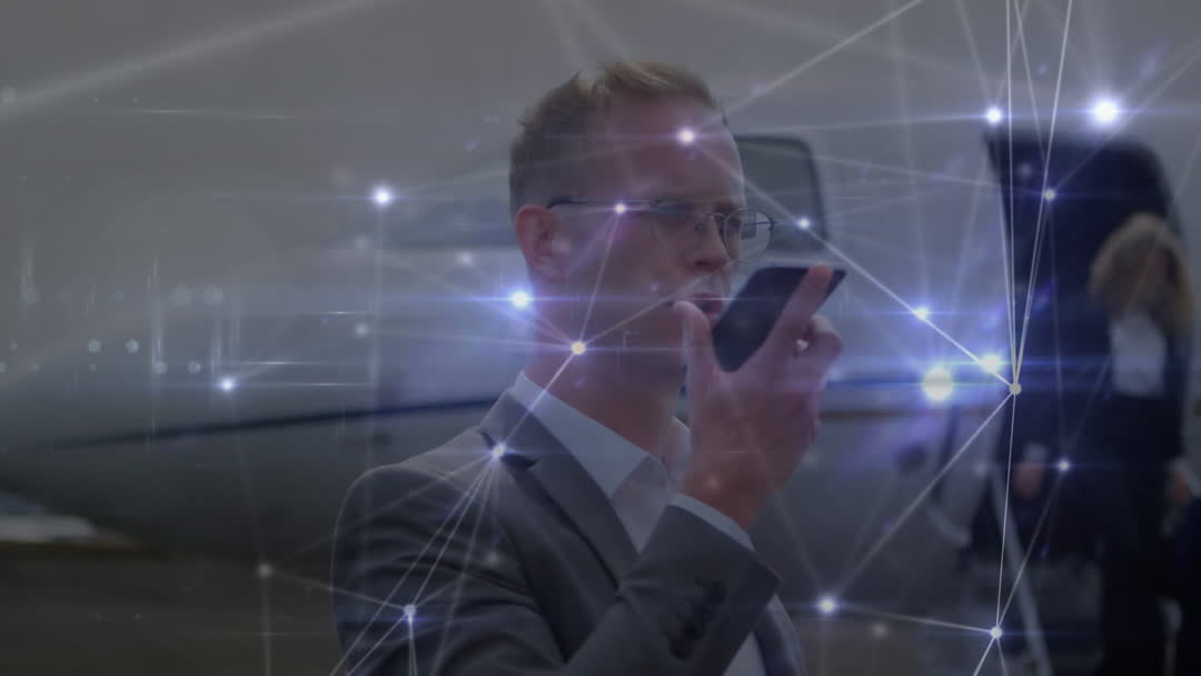 A businessman engaged in a communication activity at an airport, surrounded by animations representing digital connections. This conceptual videory showcases the integration of technology and business in the modern era, conveying themes of connectivity, global networks, and innovation. Ideal for illustrating concepts of future technology, smart business solutions, and global connectivity in business settings.