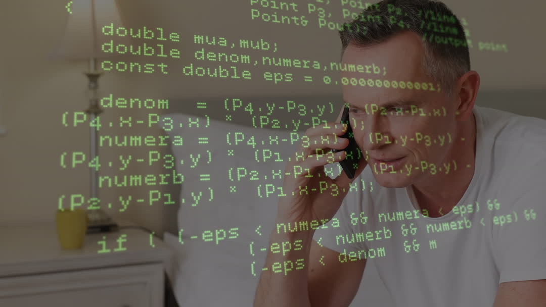 A businessman in casual attire engaging in a phone conversation, with digital code as an overlay. This concept represents remote work and digital communication in a modern business context, suitable for illustrating technology, telecommuting, and data-driven discussions.