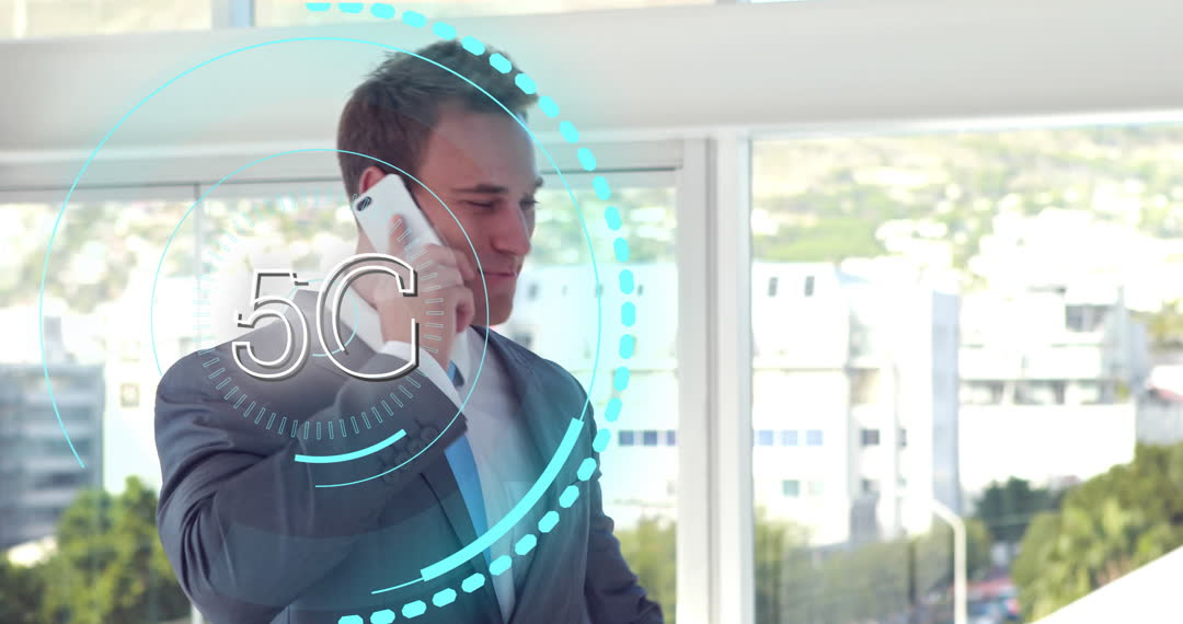 Professional business setting highlighting 5G communication. Ideal for showcasing advancements in mobile technology and network connectivity, suitable for presentations or marketing related to modern telecommunication solutions.