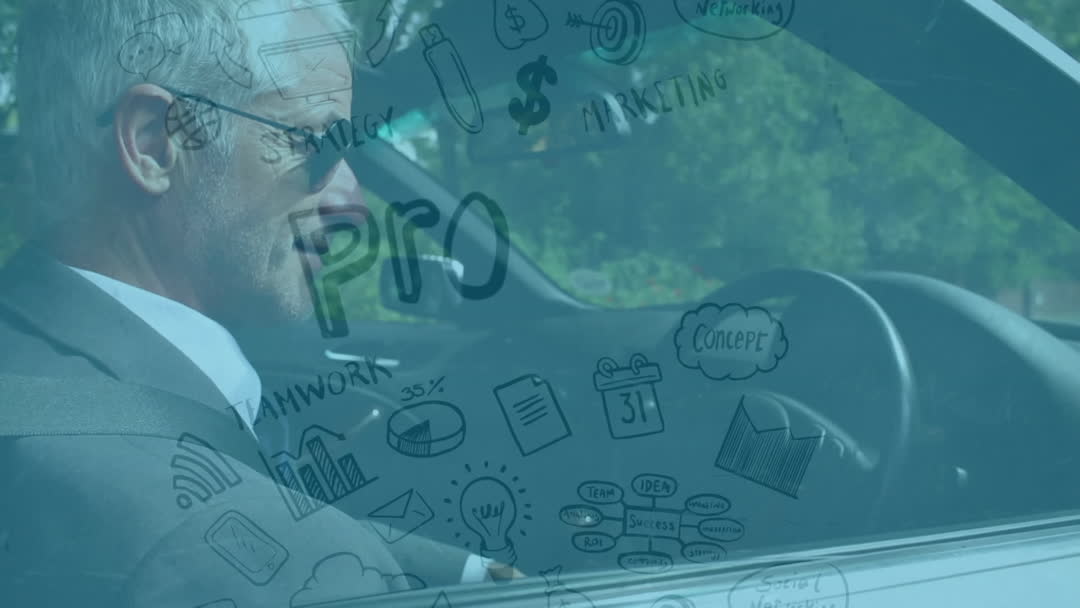 Businessman Driving with Digital Marketing Graphics Overlay Video