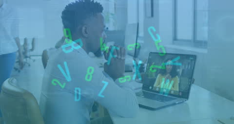 A businessman is deeply engaged in a video conference using a laptop. Digital overlays of numbers and icons symbolize an engaging digital interface in a modern office environment. This video represents themes of technology, global networking, and remote work communication, suitable for use in business, education, and technology presentations or articles focusing on digital transformation and virtual collaboration in the workplace.