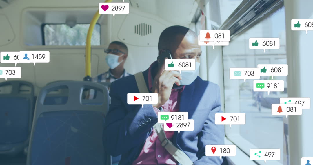 Dynamic visual depicts an African American businessman seated in a public transport vehicle, immersed in a smartphone conversation. Social media icons with numbers hover around, representing digital interaction and engagement. Suitable for illustrating concepts of connectivity, technology integration, social networking in urban environments, and modern communication in public settings.