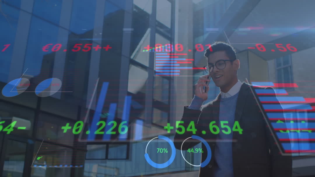 Businessman is walking outside a modern glass building while engaged on a phone call. Financial data and stock market information display as a digital overlay. This illustration is ideal for representing concepts related to financial analytics, global business, investment strategies, data-driven decision-making, and modern technological advancements in finance.