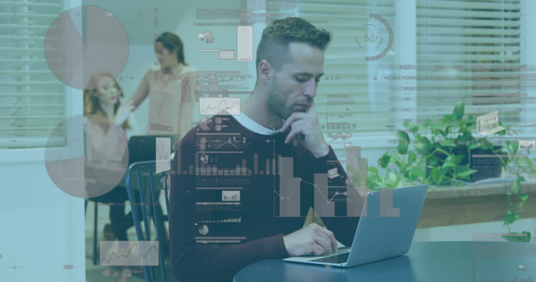 This stock photo features a businessman working intently on a laptop, surrounded by digital interface graphics, suggesting data analysis and technology integration. The scene captures a corporate environment promoting technology-driven business strategies. Ideal for use in business presentations, tech company marketing materials, and on websites focused on data management and processing solutions.