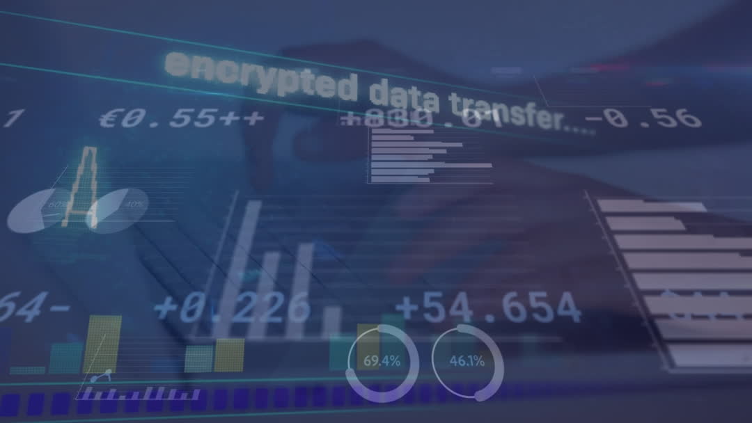 Abstract composition featuring businessman actively interacting with data on laptop screen. Various graphs and terms like 'encrypted data transfer' emphasize digital security in business analytics. Ideal for illustrating concepts involving cybersecurity, financial analysis, and corporate technology solutions.