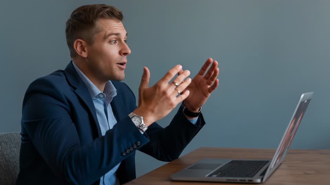 - Businessman Engaging in Virtual Meeting on Laptop in Professional Setting