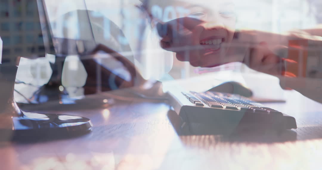 Conceptual fusion of a businessman using digital technology at an office desk, illustrating integration of smartphone applications with a global map and various multimedia elements. Ideal for conveying modern business efficiency, tech innovation, and cutting-edge communication strategies in marketing or technological showcases.