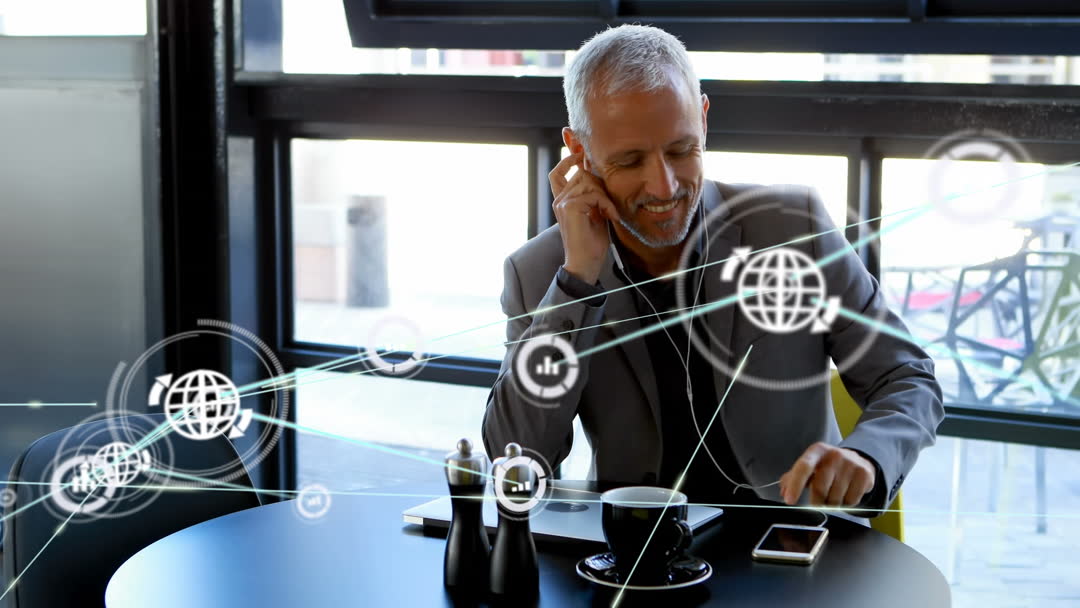 Mature businessman in modern suit sits at table, engaging with digital touch screen overlay of global connections and networking icons while using a smartphone in trendy café environment. Ideal for illustrating themes of business communication, remote work, global networking, and advanced technology in contemporary professional settings.