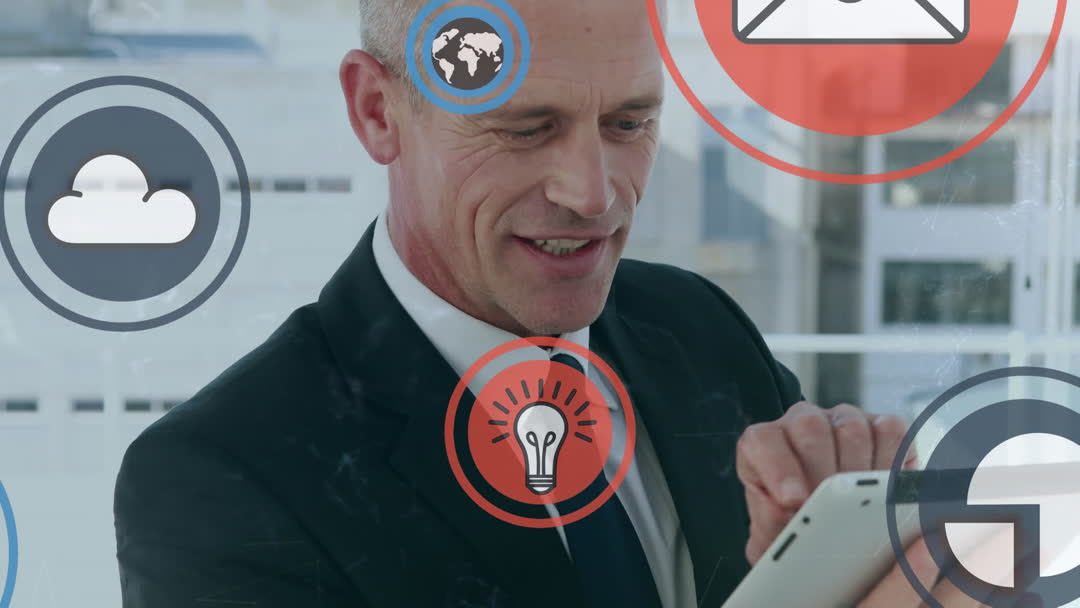 Business setting with a businessman interacting with a smartwatch, adorned by multiple technology icons representing ideas, cloud computing, messaging, and globalization. This can illustrate technological engagement in professional environments. Useful for content related to business technology, digital communication strategies, and innovation in modern workplaces.