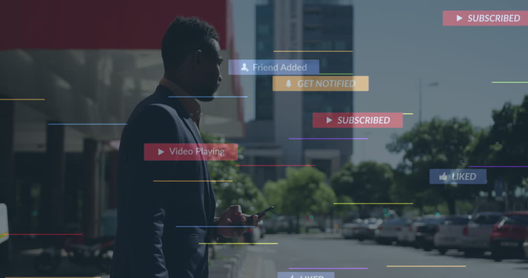 African American businessman using smartphone while social media notifications appear nearby. This video represents digital connectivity and modern communication, ideal for illustrating concepts in business technology and social media marketing campaigns.