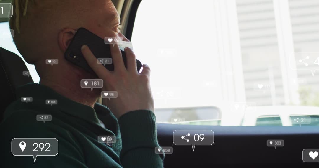 Albino African American businessman holds a smartphone to his ear in a moving car while social media icons and interaction metadata animation floats around him. Highlighting digital engagement and connectivity in modern business settings, suitable for illustrating concepts of social media communication, business technology use, and global connectivity. Ideal for blogs, articles, and presentations focused on technology and communication trends.
