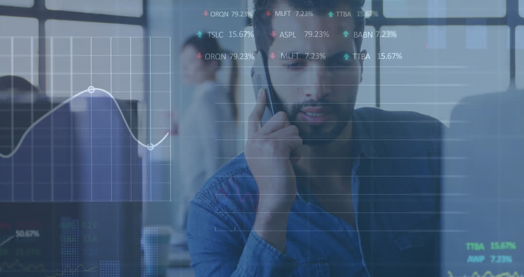 A businessman is actively discussing on a smartphone, seamlessly integrating with layers of animated stock market data. This conveys themes of business technology, financial analysis, investment consultations, and data-driven decisions in a professional setting. Ideal for illustrating modern financial practices, cutting-edge technology in business, or representing mobile stock trading solutions.