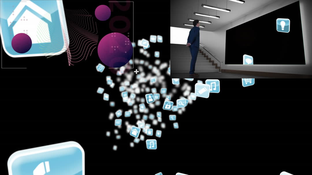 Caucasian businessman stands in room filled with virtual home screen icons. Dots and digital patterns float in foreground, creating connection and innovation feel. Ideal for presentations on digital communication, networking, and innovative technology designs.