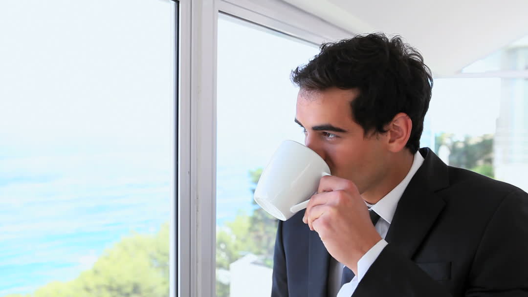 - Businessman Enjoying Coffee Break While Gazing Out Window