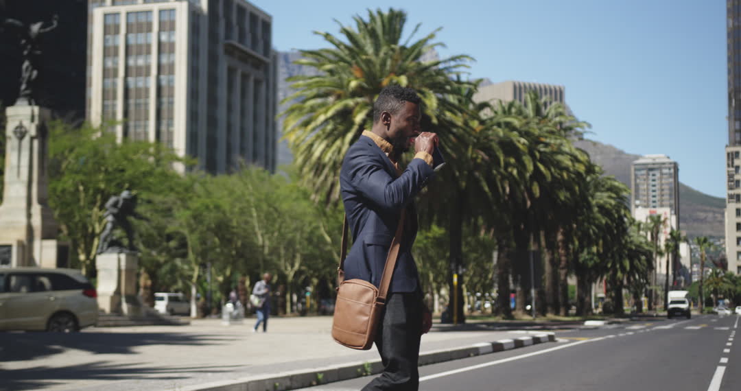 Young businessman in a casual suit carrying a leather bag, drinking takeaway coffee while walking on a bustling urban street lined with palm trees and high-rise buildings. Ideal for illustrating urban lifestyle, cultural diversity in cities, outdoor commuting, or business travel themes.