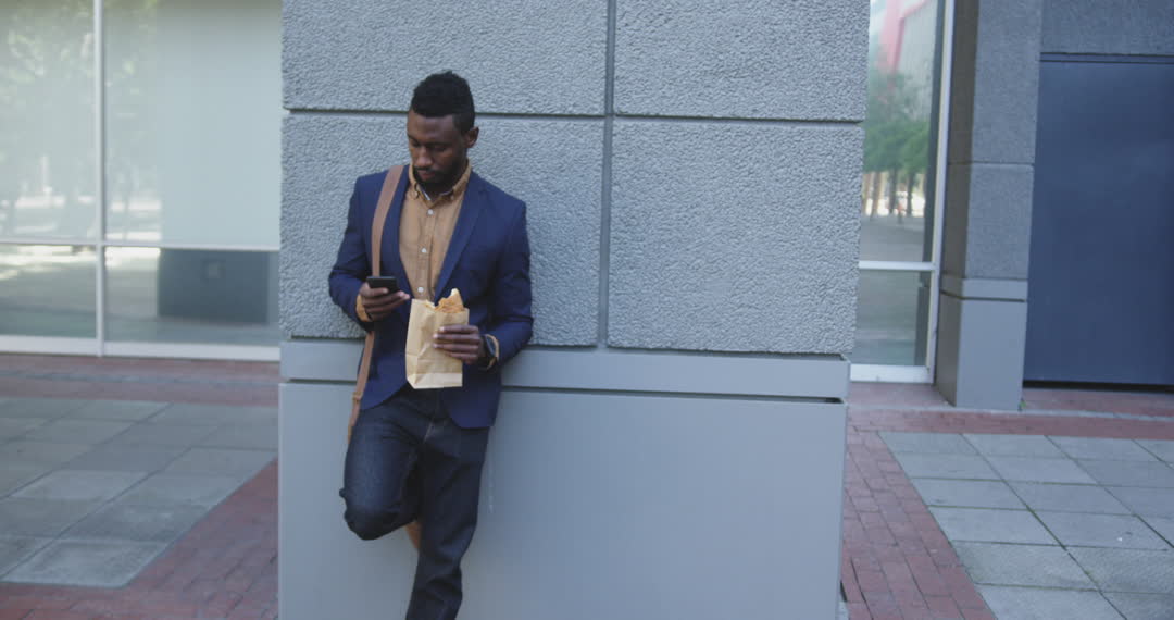 A businessman dressed in smart-casual attire leans against a building facade in an urban area, enjoying a break from work. He holds a sandwich and checks his smartphone, portraying a modern professional managing work-life balance. This could be used in articles or content about daily commuter routines, urban work culture, and lifestyle tips for busy professionals.