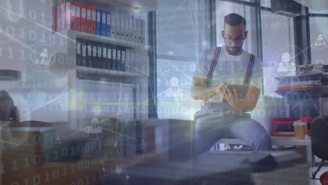 A professional businessman engages with a digital tablet in a futuristic office setting, surrounded by animated data processing graphics suggesting digital transformation and network connections. This video is suitable for illustrating concepts of business technology, digital innovation, data analytics, and modern work environments, ideal for use in technology blogs, business software advertisements, and articles on digital transformation.