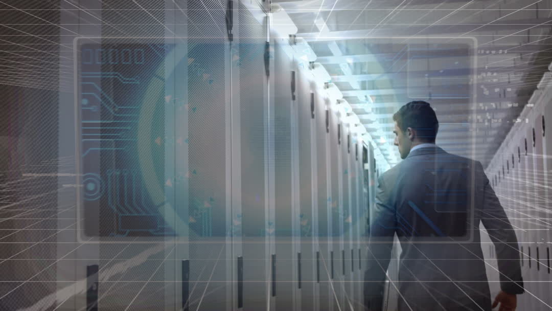 Businessman walking through data center filled with computer servers, symbolizing digital technology advancements. Overlaid animation indicates data processing or cyber systems. Useful for themes on digital innovation, IT infrastructure, cybersecurity, business technology solutions, and global data management.