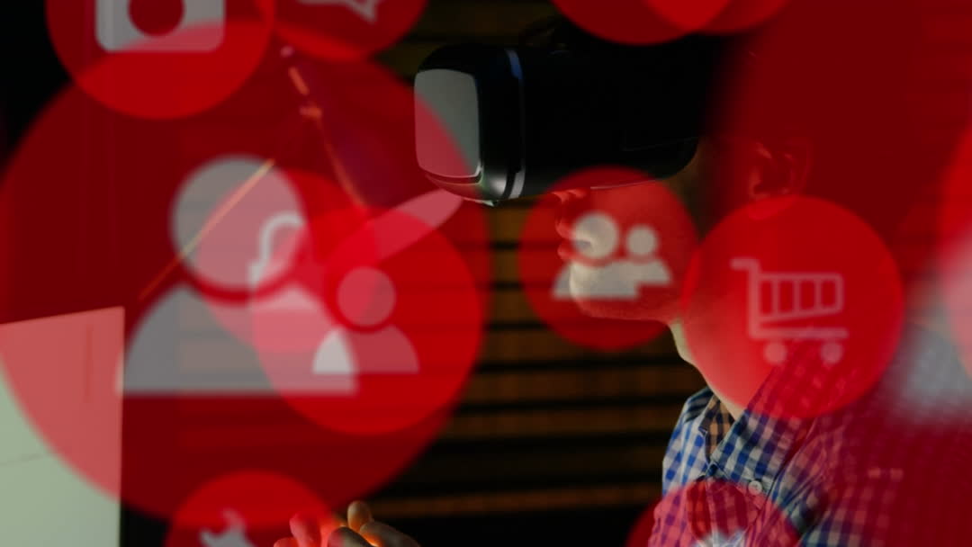 Businessman using virtual reality headset surrounded by digital communication icons illustrates innovative technologies in a corporate environment. Ideal for use in articles or presentations exploring tech advances, remote collaboration tools, and digital transformation in businesses.