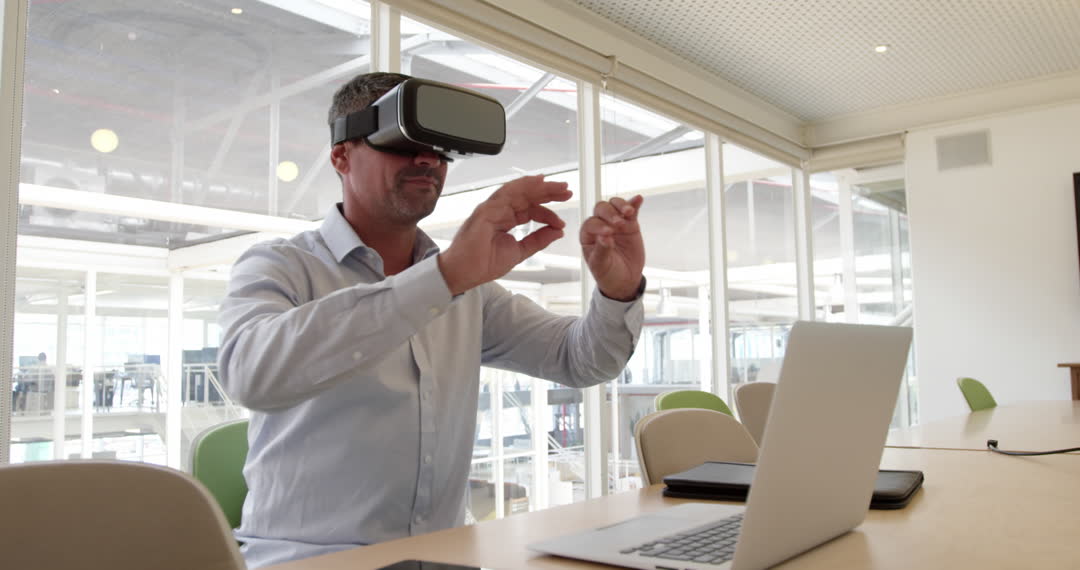 - Businessman Exploring Virtual Reality with Headset in Modern Office