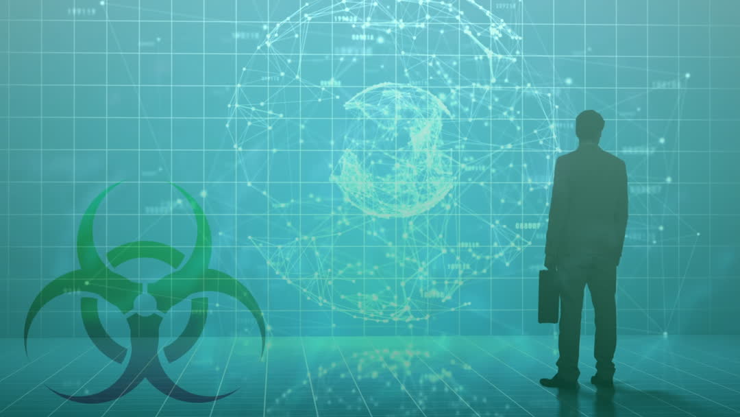 Businessman facing a digital globe interconnected with network lines inside a technologically advanced environment. Biohazard symbol visible, representing challenges or risks. Useful for concepts of global business trends, technology's impact on industries, cybersecurity risks, and data analysis.