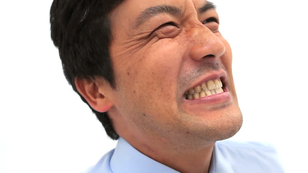 Businessman displaying a grimacing expression commonly associated with pain or stress. Ideal for use in articles discussing workplace stress, mental health topics, or conveying feelings of discomfort and challenges faced in business or corporate settings.