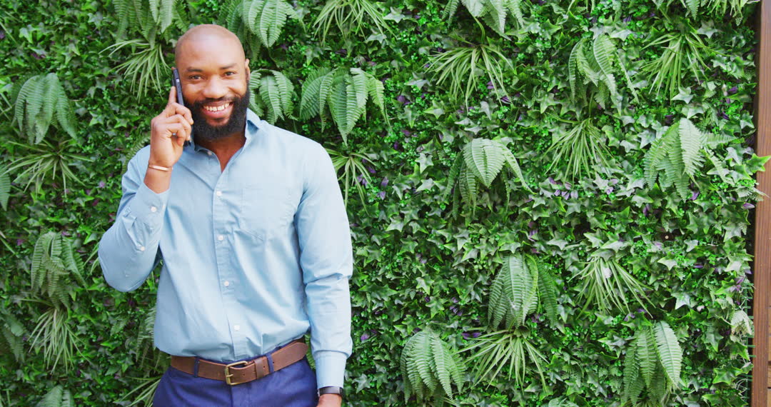 Professionally dressed businessman having a cheerful phone conversation stands against lush wall of greenery. Suitable for themes like business communication, nature-infused work spaces, eco-friendly environments, and modern professional lifestyle.